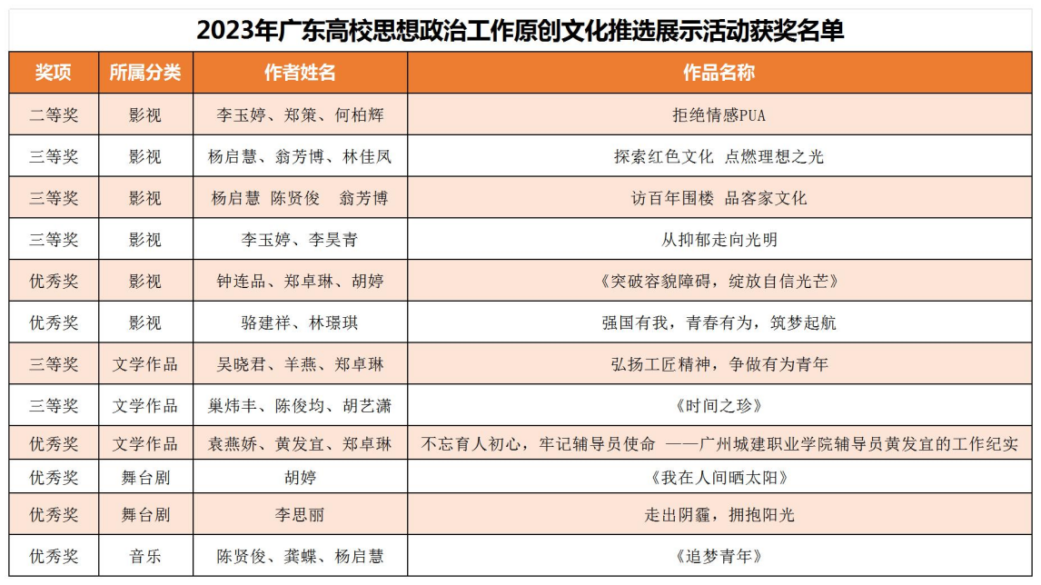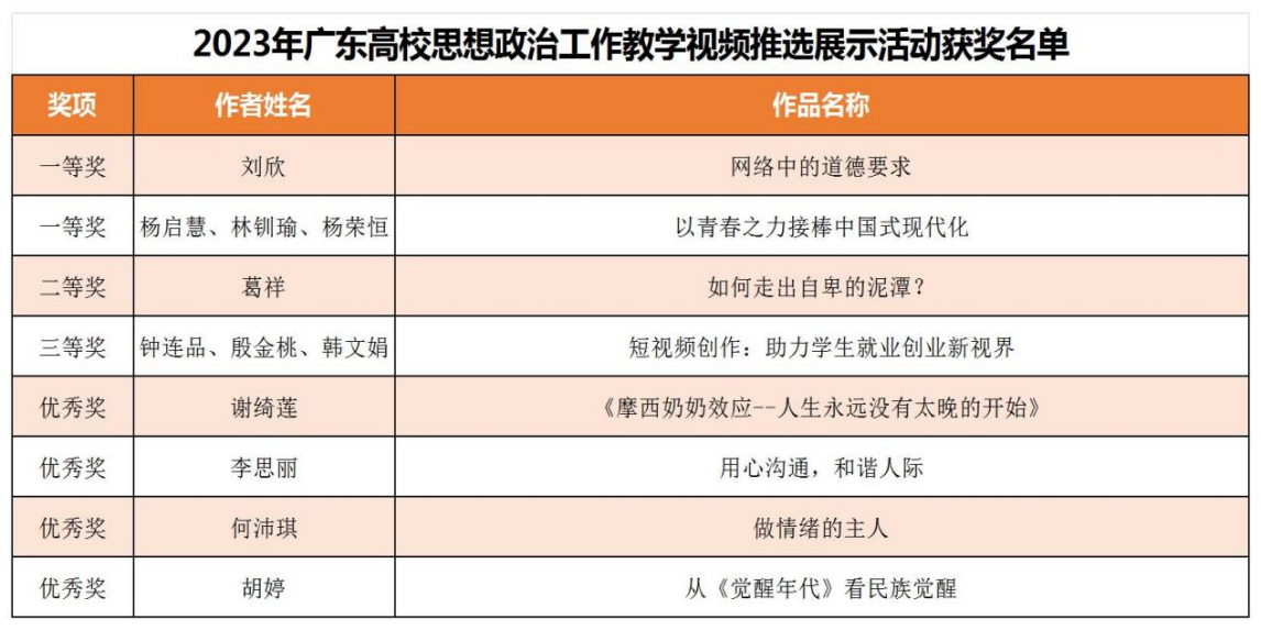 4月2日,由廣東省高校思想政治工作隊伍培訓研修中心(華南師范大學)組織開展的2023年廣東高校思想政治工作教學視頻及原創(chuàng)文化推選展示活動結果公布。我校共有20項作品獲獎,其中教學視頻作品獲一等獎2項,二等獎1項,三等獎1項,優(yōu)秀獎4項,同類院校中唯一獲一等獎獎項;原創(chuàng)文化作品獲二等獎1項,三等獎5項,優(yōu)秀獎6項,同類院校中獲獎數(shù)量和等級排名第一。