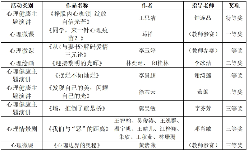 我校師生在廣東省大學(xué)生心理健康月系列活動(dòng)中的優(yōu)異表現(xiàn),不僅為學(xué)校贏得了榮譽(yù),也為推動(dòng)全省大學(xué)生心理健康教育工作的發(fā)展做出了積極貢獻(xiàn)。我校將繼續(xù)開展形式多樣的心理健康主題教育活動(dòng),不斷增強(qiáng)心理健康教育吸引力和感染力,提高大學(xué)生心理素質(zhì),促進(jìn)學(xué)生心理健康素質(zhì)與思想道德素質(zhì)、科學(xué)文化素質(zhì)協(xié)調(diào)發(fā)展。