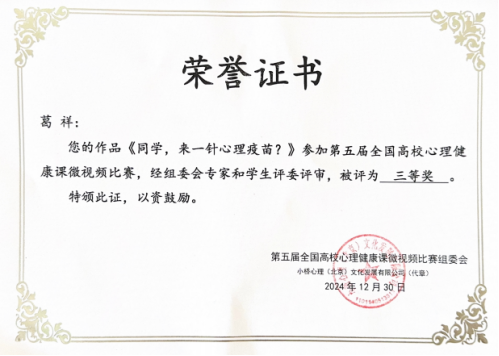 2024年12月11日,第五屆全國高校心理健康課微視頻決賽落下帷幕。本次比賽吸引了來自26個省份、108所高校參加,經(jīng)過激烈角逐,大賽評審出一等獎8項(xiàng)、二等獎16項(xiàng)、三等獎24項(xiàng),以及最佳剪輯獎5項(xiàng)等多個獎項(xiàng),其中,我校心理健康咨詢中心專職教師葛祥的參賽作品《同學(xué),來一針心理疫苗?》榮獲第五屆全國高校心理健康課微視頻比賽三等獎及最佳剪輯獎!