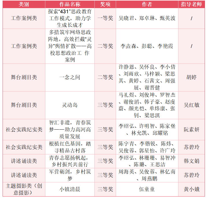 近日,廣東省教育廳公布了2024年“立志·修身·博學(xué)·報國”主題教育系列活動評選結(jié)果,我校師生團(tuán)隊參賽作品在工作案例類、舞臺劇目類、社會實踐紀(jì)實類、講述誦讀類和主題攝影類項目中榮獲一等獎一項、二等獎兩項、三等獎六項,獲獎數(shù)量和質(zhì)量均實現(xiàn)新突破,在同類院校中位居前列。