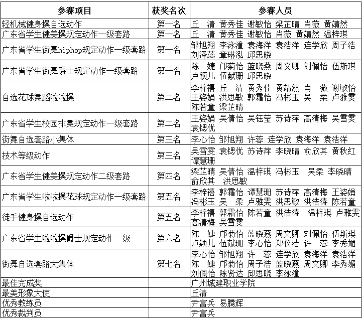 我校健美操隊(duì)參加了13個(gè)項(xiàng)目的角逐,經(jīng)過(guò)3天緊張激烈的比拼,斬獲頗豐,獲得4金、2銀等優(yōu)異成績(jī)(詳見(jiàn)下表)。
