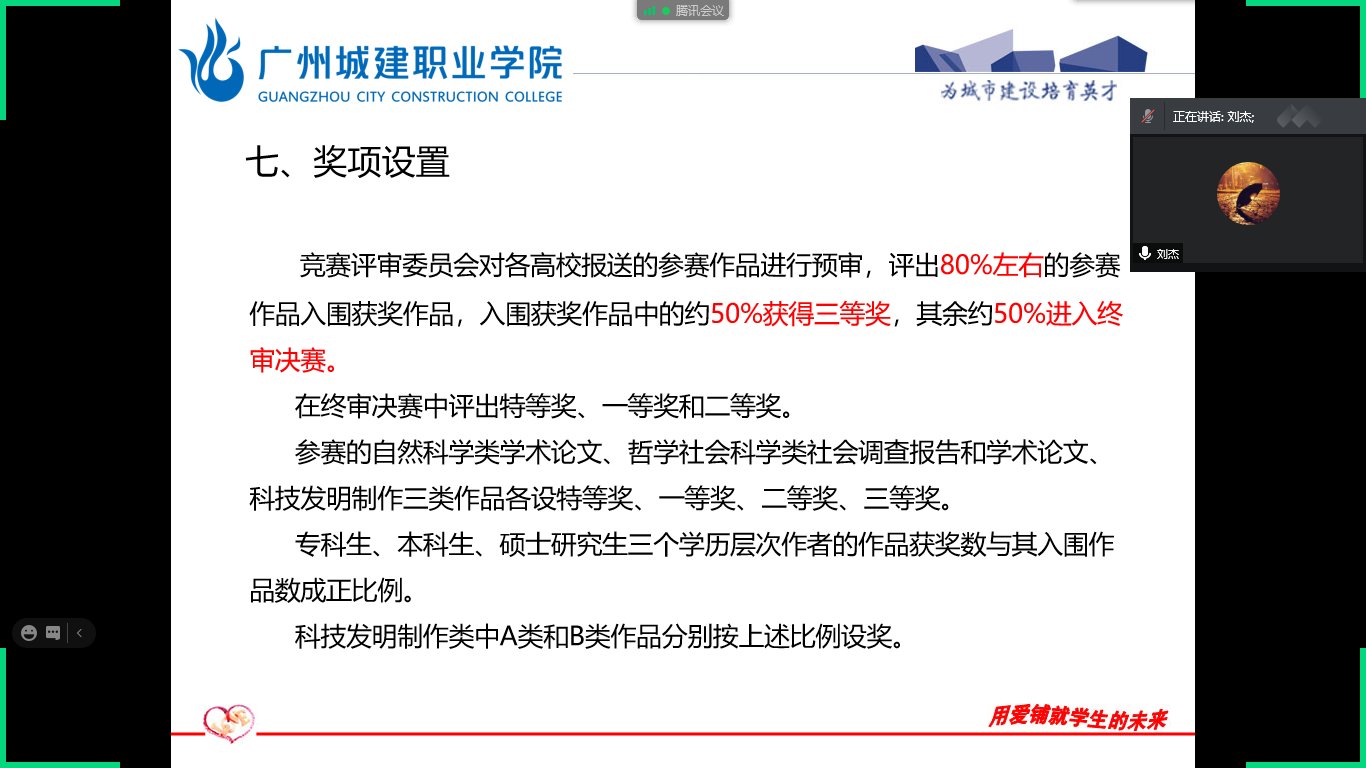信息工程學(xué)院副院長劉杰從競賽的宗旨、競賽的目的、競賽的基本方式、參賽資格與作品申報(bào)、競賽時(shí)間、報(bào)送作品數(shù)量、獎項(xiàng)設(shè)置、賽事賽項(xiàng)等八個(gè)方面對本屆賽事相關(guān)政策進(jìn)行解讀。隨后,各二級學(xué)院代表對備賽情況進(jìn)行了匯報(bào)和交流。