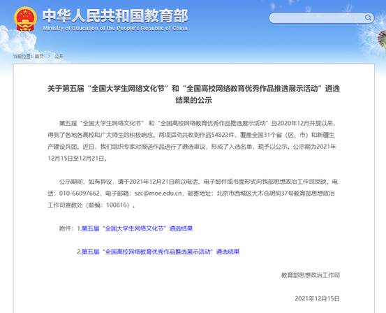 近日,教育部網(wǎng)站公示了第五屆“全國大學生網(wǎng)絡文化節(jié)”遴選結果,其中,“全國大學生網(wǎng)絡文化節(jié)”名單共入選47項廣東省高校作品,我校賴舜坤同學的作品《傳播青春正能量,爭做校園好網(wǎng)民》榮獲其他類作品優(yōu)秀獎。