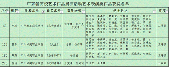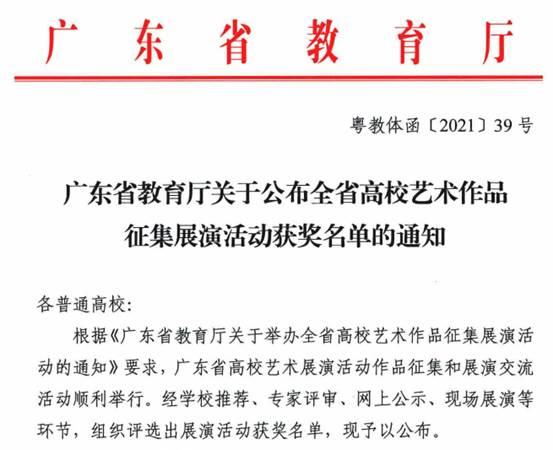 近日,廣東省教育廳發(fā)布了《廣東省教育廳關(guān)于公布全省高校藝術(shù)作品征集展演活動(dòng)獲獎(jiǎng)名單的通知》(粵教體函〔2021〕39號(hào)),我校在省高校藝術(shù)作品征集展演活動(dòng)中榮獲10個(gè)獎(jiǎng)項(xiàng),其中一等獎(jiǎng)3項(xiàng)、二等獎(jiǎng)2項(xiàng)、三等獎(jiǎng)5項(xiàng)。