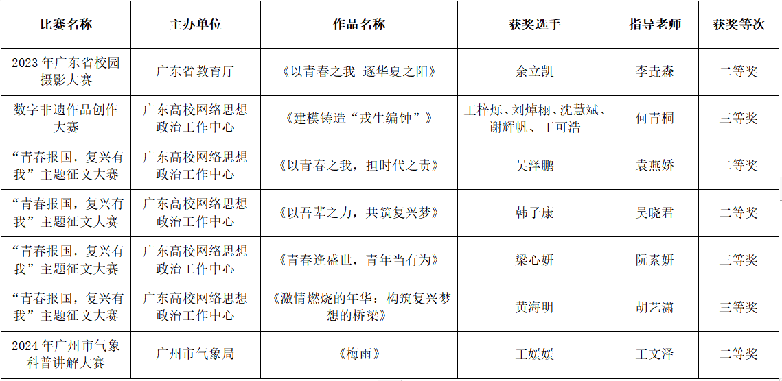 在由廣東省教育廳主辦的“強國有我 筑夢青春”——2023年廣東省校園攝影大賽中,我校作品《以青春之我逐華夏之陽》榮獲“二等獎”;在由廣東高校網(wǎng)絡思想政治工作中心主辦的以“數(shù)字化·傳承·創(chuàng)新·探索非物質(zhì)文化遺產(chǎn)的3D未來”為主題的數(shù)字非遺作品創(chuàng)作大賽中,我校推薦的作品《建模鑄造“戎生編鐘”》榮獲“三等獎”;在由廣東高校網(wǎng)絡思想政治工作中心主辦的“青春報國,復興有我”主題征文大賽中,我校推薦的作品《以青春之我,擔時代之責》《以吾輩之力,共筑復興夢》榮獲“二等獎”,《青春逢盛世,青年當有為》《激情燃燒的年華:構筑復興夢想的橋梁》榮獲“三等獎”;在由廣州市氣象局、廣州市氣象學會舉辦的2024年廣州市氣象科普講解大賽中,我校選手王媛媛同學榮獲市決賽“二等獎”、區(qū)選拔賽“一等獎”,同時被聘為從化區(qū)“特約科普講解員”。