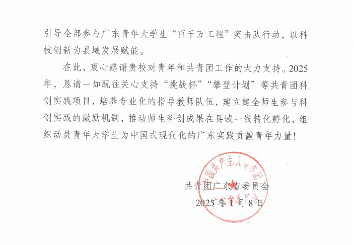 近日,我校收到了來自共青團(tuán)廣東省委員會(huì)的感謝信,對(duì)我校在青年和共青團(tuán)工作領(lǐng)域所展現(xiàn)出的卓越組織能力和取得的優(yōu)異成績(jī)表示高度贊賞和衷心感謝,并勉勵(lì)我校要一如既往關(guān)心支持“挑戰(zhàn)杯”“攀登計(jì)劃”等共青團(tuán)科創(chuàng)實(shí)踐項(xiàng)目,培養(yǎng)專業(yè)化的指導(dǎo)教師隊(duì)伍,建立健全師生參與科創(chuàng)實(shí)踐的激勵(lì)機(jī)制,推動(dòng)師生科創(chuàng)成果在縣域一線轉(zhuǎn)化孵化,組織更多青年大學(xué)生為中國(guó)式現(xiàn)代化的廣東實(shí)踐貢獻(xiàn)青年力量。