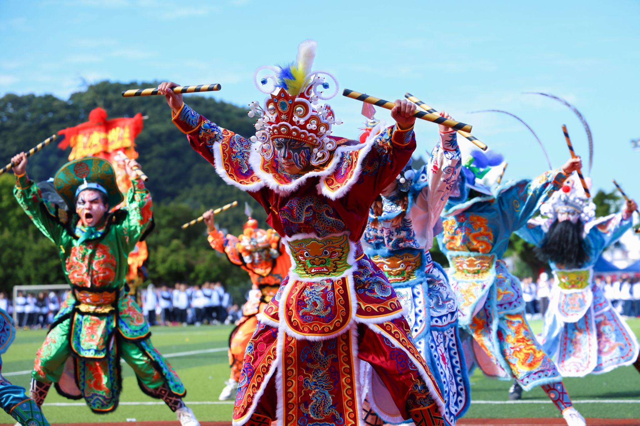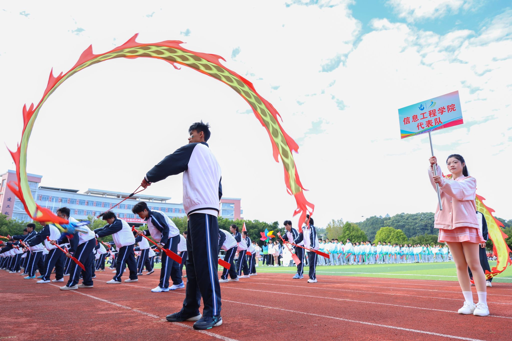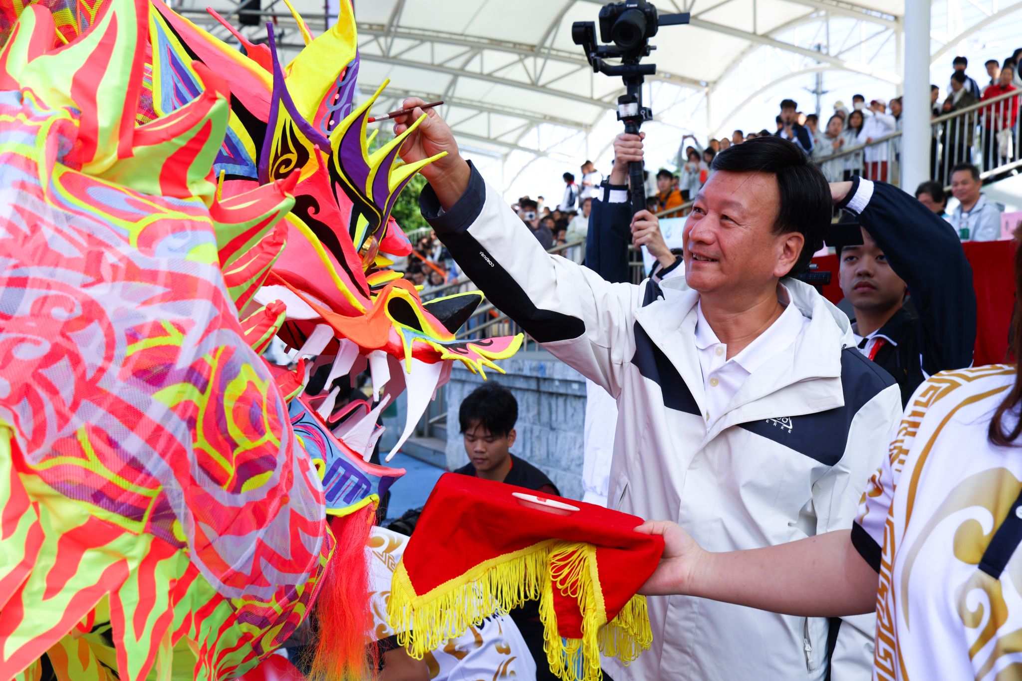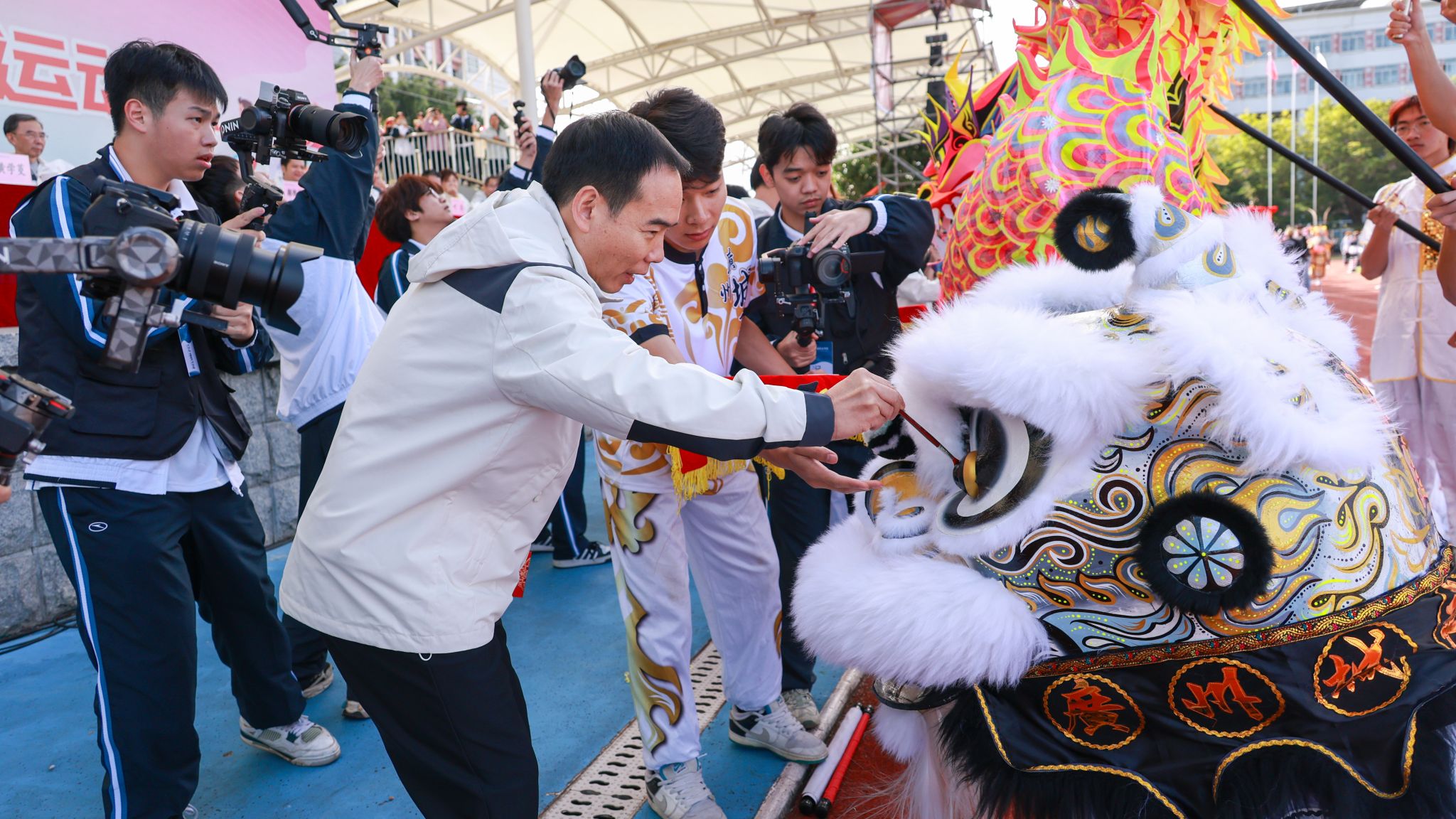 開(kāi)幕式上,張亞斌、黃學(xué)茭、李國(guó)年共同執(zhí)筆,為新龍和新獅子點(diǎn)睛。接著,一系列精彩表演輪番上演,剛勁威猛的龍獅表演,舞動(dòng)出傳統(tǒng)文化的雄渾氣韻;氣勢(shì)磅礴的英歌舞,躍動(dòng)著青春的節(jié)奏與力量;柔和連綿的千人八段錦,在一招一式中蘊(yùn)藏著動(dòng)靜相生的養(yǎng)生智慧;最后,活力四射的千人啦啦操表演瞬間點(diǎn)燃全場(chǎng)激情,為運(yùn)動(dòng)健兒加油助威。
