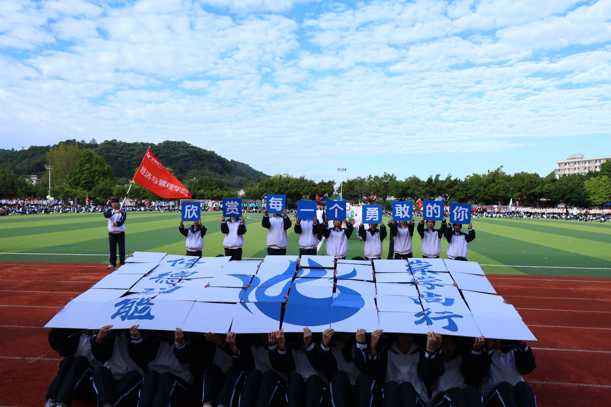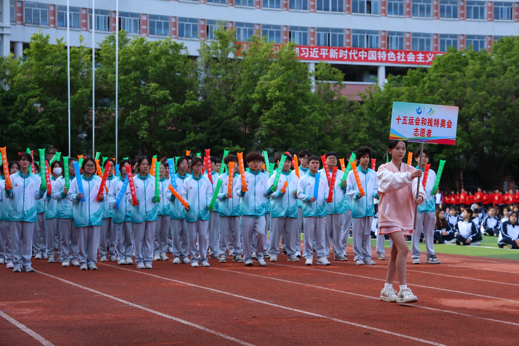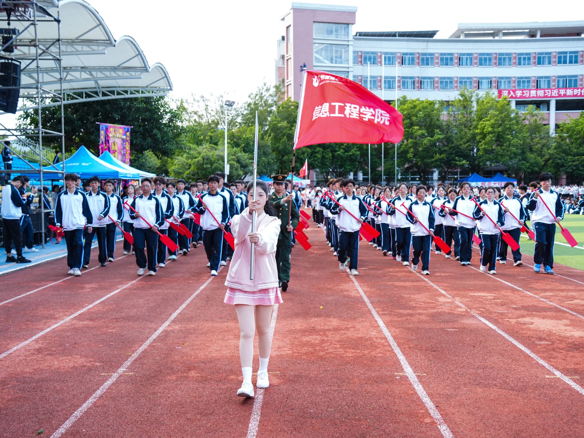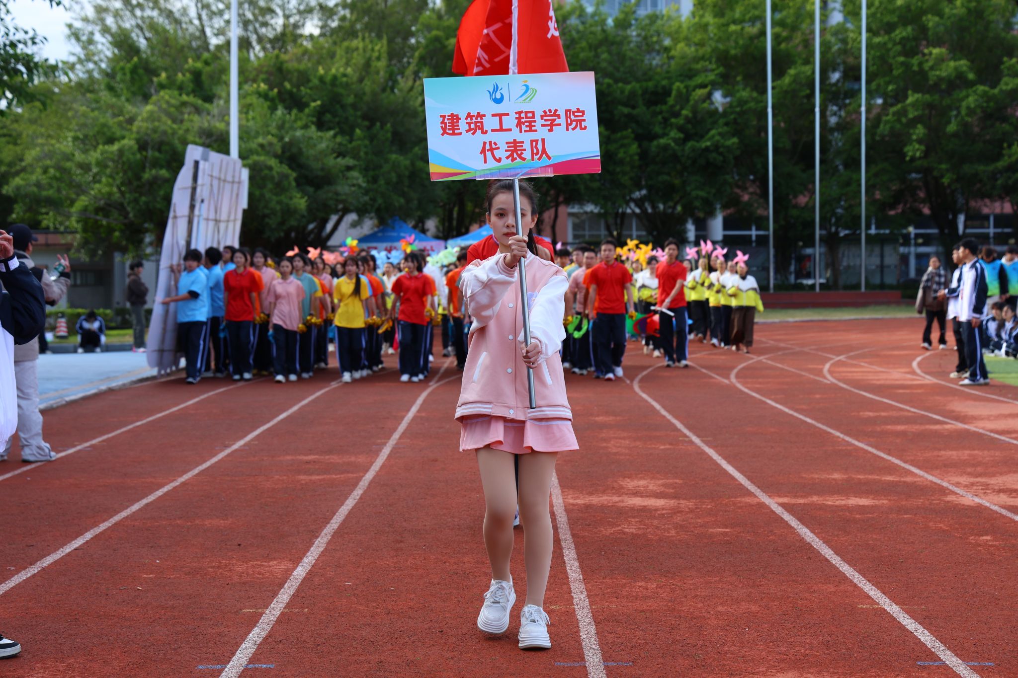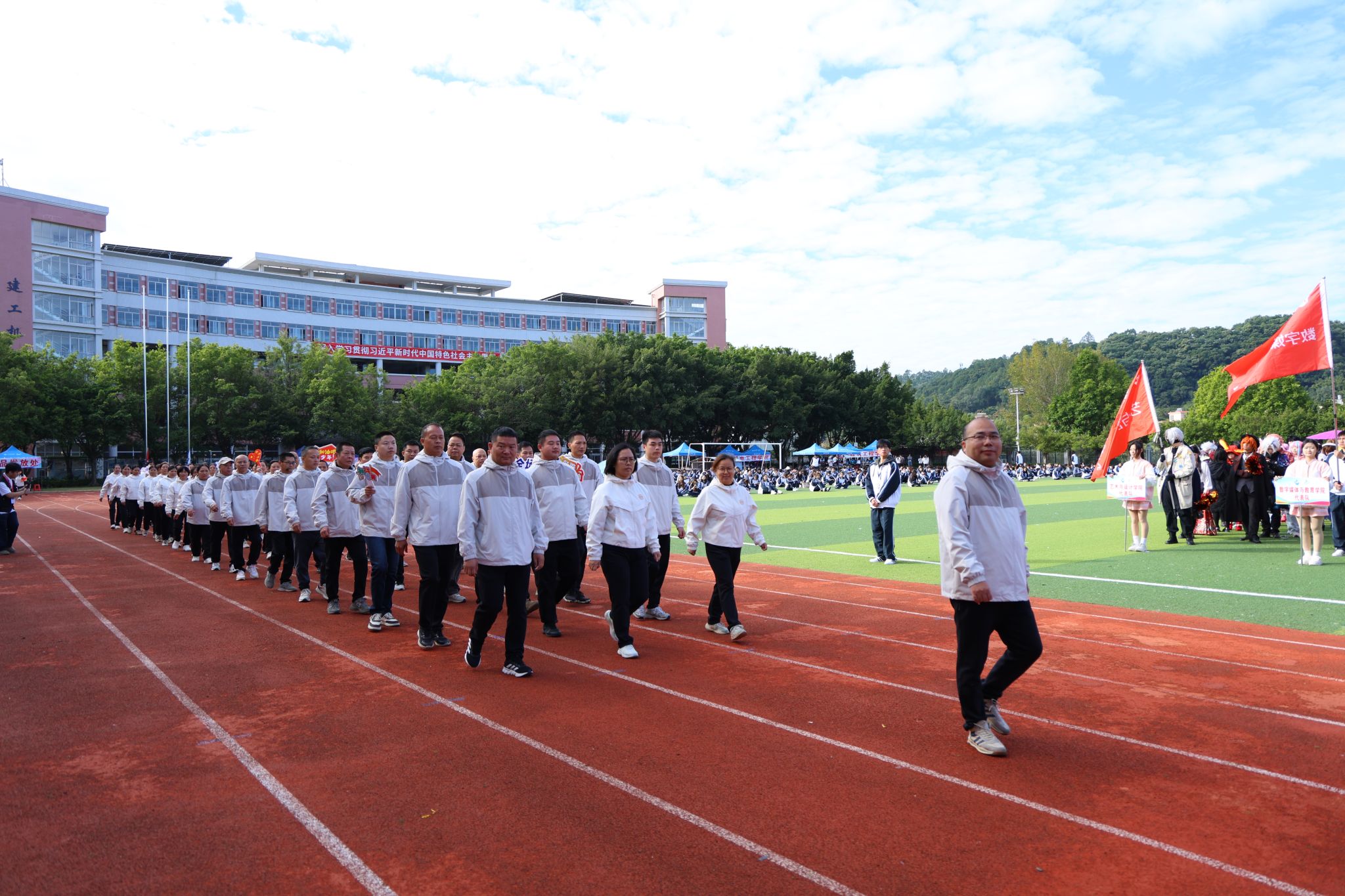 伴隨著雄壯激昂的《運(yùn)動(dòng)員進(jìn)行曲》,國(guó)旗、校旗、運(yùn)動(dòng)會(huì)會(huì)旗、裁判員、十五運(yùn)會(huì)和殘?zhí)貖W會(huì)志愿者、各二級(jí)學(xué)院、機(jī)關(guān)、保衛(wèi)、后勤等方陣逐一亮相,有序入場(chǎng)。他們精神抖擻,口號(hào)響亮,創(chuàng)意迭出,以昂揚(yáng)風(fēng)貌展現(xiàn)了城建人的蓬勃朝氣與強(qiáng)大凝聚力。