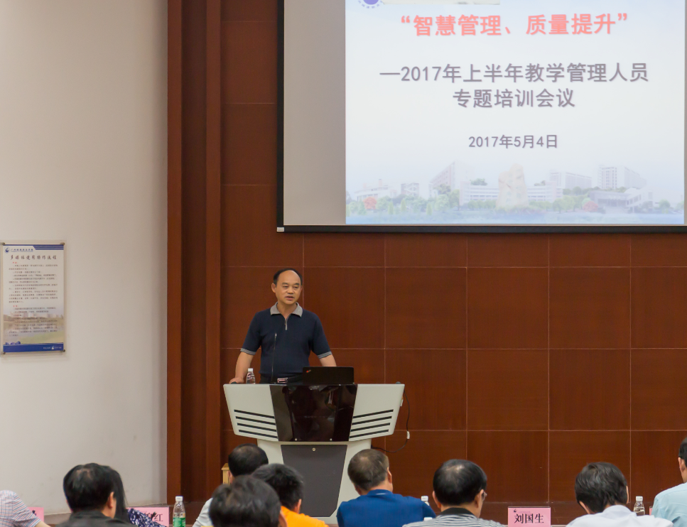 為進(jìn)一步提升學(xué)校教學(xué)管理水平,促進(jìn)教學(xué)一線管理人員規(guī)范化服務(wù)、專業(yè)化發(fā)展,為學(xué)校“2235”創(chuàng)強(qiáng)工程內(nèi)涵發(fā)展注入新活力,5月4日至5日,學(xué)校在建工機(jī)電樓A101組織召開了2017年上半年教學(xué)管理人員專題培訓(xùn)會(huì)議。校長(zhǎng)劉國生,副校長(zhǎng)程忠國、周暉,各二級(jí)學(xué)院院長(zhǎng)、教學(xué)副院長(zhǎng)、教研室正副主任、教學(xué)秘書、相關(guān)職能部門負(fù)責(zé)人及工作人員參加會(huì)議,會(huì)議由教務(wù)處處長(zhǎng)鄢維峰主持。