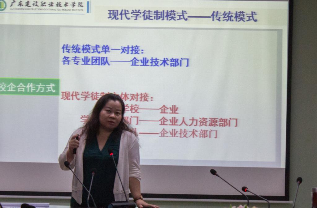 會(huì)議專(zhuān)門(mén)邀請(qǐng)廣東省現(xiàn)代學(xué)徒制工指委和廣東省建筑與房地產(chǎn)教指委秘書(shū)長(zhǎng)、廣東建設(shè)職業(yè)技術(shù)學(xué)院科研處處長(zhǎng)趙瓊梅進(jìn)行“標(biāo)準(zhǔn)建設(shè)引領(lǐng)、推進(jìn)現(xiàn)代學(xué)徒制工作”專(zhuān)題培訓(xùn)。她以“什么是現(xiàn)代學(xué)徒制”、“什么是現(xiàn)代學(xué)徒制的廣東模式”為切入點(diǎn),重點(diǎn)解讀了現(xiàn)代學(xué)徒制“三雙、一體化”的內(nèi)涵特征、精選合作優(yōu)質(zhì)企業(yè)的要點(diǎn)及簽訂合作辦學(xué)協(xié)議的難點(diǎn)。并從構(gòu)建中、高、本銜接一體化標(biāo)準(zhǔn)建設(shè)出發(fā),結(jié)合本人參與省級(jí)專(zhuān)業(yè)教學(xué)標(biāo)準(zhǔn)研制的工作經(jīng)歷,圍繞企業(yè)對(duì)現(xiàn)代學(xué)徒制人才培養(yǎng)的供需調(diào)研、學(xué)徒崗位選擇、崗位職業(yè)能力分析、現(xiàn)代學(xué)徒制課程體系構(gòu)建和標(biāo)準(zhǔn)編制等作了經(jīng)驗(yàn)分享,并和與會(huì)代表作了溝通交流。