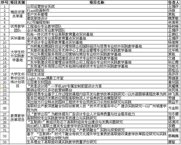 近日,從《廣東省教育廳關(guān)于公布2015年度省高職教育質(zhì)量工程立項(xiàng)建設(shè)項(xiàng)目的通知》(粵教高函〔2016〕135號)獲悉,我校申報(bào)的2015年度廣東省高等學(xué)校教學(xué)質(zhì)量與教學(xué)改革工程(簡稱“質(zhì)量工程”)高職類項(xiàng)目,有33個項(xiàng)目獲得立項(xiàng)建設(shè)。其中精品開放課程5項(xiàng),優(yōu)秀教學(xué)團(tuán)隊(duì)2項(xiàng),實(shí)訓(xùn)基地3項(xiàng),大學(xué)生校外實(shí)踐教學(xué)基地6項(xiàng),大學(xué)生創(chuàng)新創(chuàng)業(yè)訓(xùn)練計(jì)劃6項(xiàng),教育教學(xué)改革項(xiàng)目11項(xiàng)。希望各項(xiàng)目落實(shí)責(zé)任,加強(qiáng)項(xiàng)目管理,高質(zhì)量地完成項(xiàng)目建設(shè)任務(wù)。