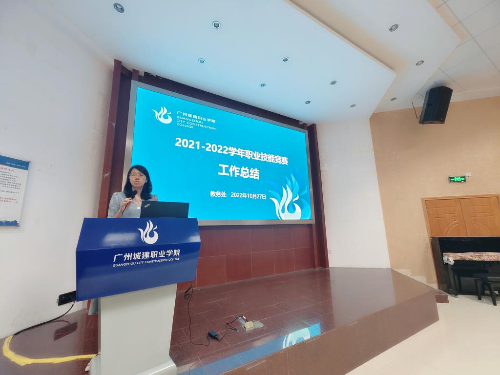 在總結(jié)表彰環(huán)節(jié),全體人員首先通過一段視頻回顧了上學(xué)年學(xué)校各類職業(yè)技能大賽的精彩花絮。隨后,唐玉群從競賽亮點(diǎn)成績、競賽推動(dòng)舉措以及進(jìn)一步推進(jìn)計(jì)劃三個(gè)方面對2021-2022學(xué)年職業(yè)技能大賽工作進(jìn)行總結(jié)。