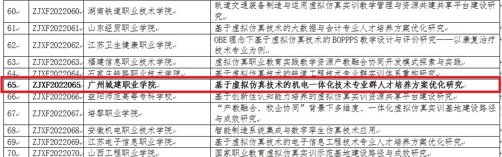 11月7日,教育部高等學(xué)校科學(xué)研究發(fā)展中心發(fā)布了《關(guān)于公布2022年度<虛擬仿真技術(shù)在職業(yè)教育教學(xué)中的創(chuàng)新應(yīng)用>專項(xiàng)課題名單的通知》,學(xué)校申報(bào)的《基于虛擬仿真技術(shù)的機(jī)電一體化技術(shù)專業(yè)群人才培養(yǎng)方案優(yōu)化研究》獲批立項(xiàng)。
