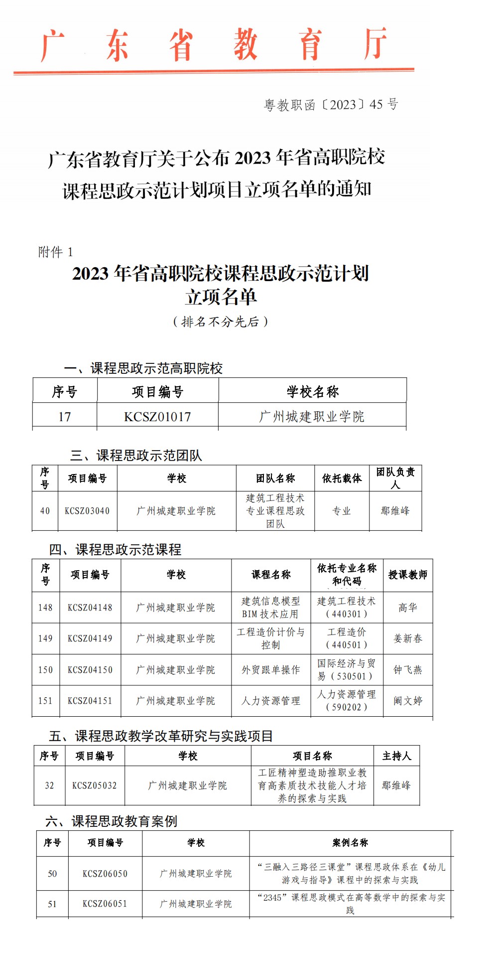 近日,廣東省教育廳公布2023年省高職院校課程思政示范計劃項目立項名單,我校成功入選2023年省課程思政示范高職院校。同時,我校建筑工程技術(shù)專業(yè)課程思政團隊獲批省級課程思政示范團隊;《建筑信息模型BIM技術(shù)應(yīng)用》等4門課程獲批省級思政示范課程;“工匠精神塑造助推職業(yè)教育高素質(zhì)技術(shù)技能人才培養(yǎng)的探索與實踐”獲批省級課程思政教學(xué)改革研究與實踐項目;《“三融入三路徑三課堂”課程思政體系在<幼兒游戲與指導(dǎo)>課程中的探索與實踐》等2個案例獲批省級課程思政教育案例。