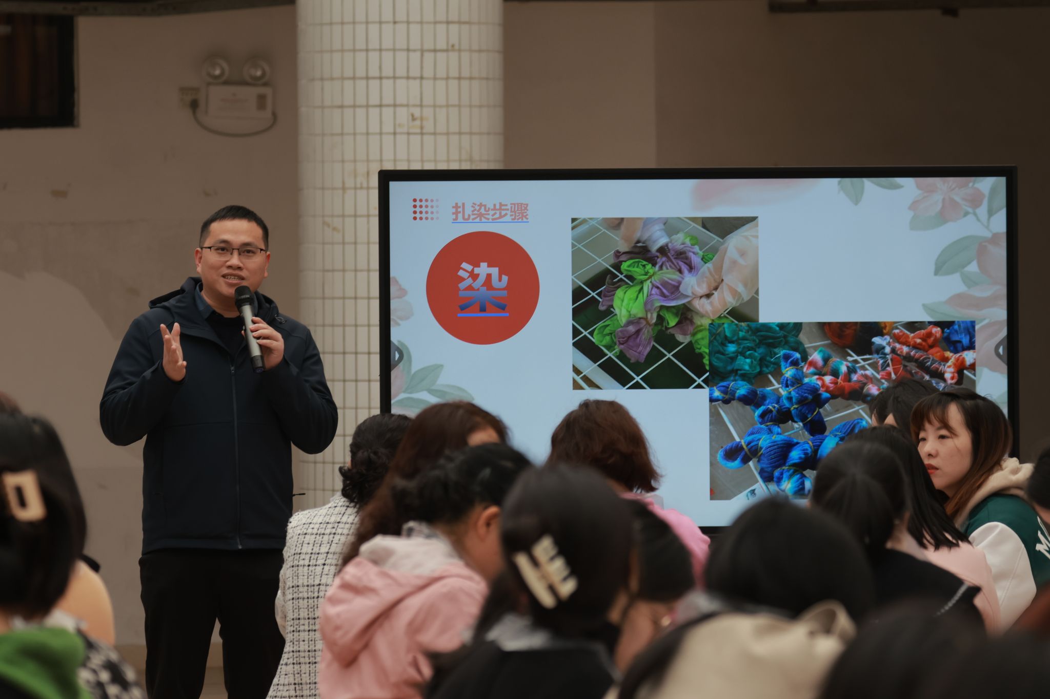 活動過程中,專業(yè)老師詳細(xì)講解了扎染的工藝原理、扎花重點(diǎn)、浸染手法以及制作必備的各種材料,現(xiàn)場示范扎結(jié)與染色具體制作流程,女教職工們在老師的帶領(lǐng)下通過洗布、扎花、浸染、晾干等步驟,紛紛DIY出獨(dú)一無二的彩色帆布袋。