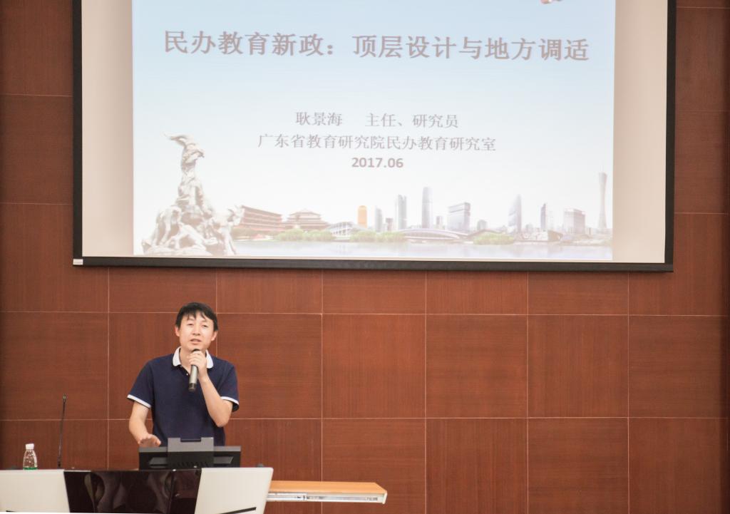 耿主任以《民辦教育新政:頂層設計與地方調適》為題,對《民辦教育促進法(修訂案)》、《國務院關于鼓勵社會力量興辦教育促進民辦教育健康發(fā)展的若干意見》和《關于加強民辦學校黨的建設工作的意見》等民辦教育新法新規(guī)和重要文件進行了深入淺出地解讀,幫助廣大教職工對新法新規(guī)的理解和把握。隨后,他從國家宏觀政策層面、地方政府配套政策走向及新政對民辦教育的主要影響與民辦學校的發(fā)展方向作了深度分析。