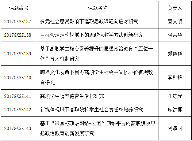 從《廣東省教育廳關(guān)于2017年省級學校德育項目立項的通知》獲悉,分別由董文明、侯榮華、郭巍巍、李科鋒、孔練光、戚洪娜、楊清國負責申報的7項課題獲批立項為2017年省級高校思想政治教育課題。