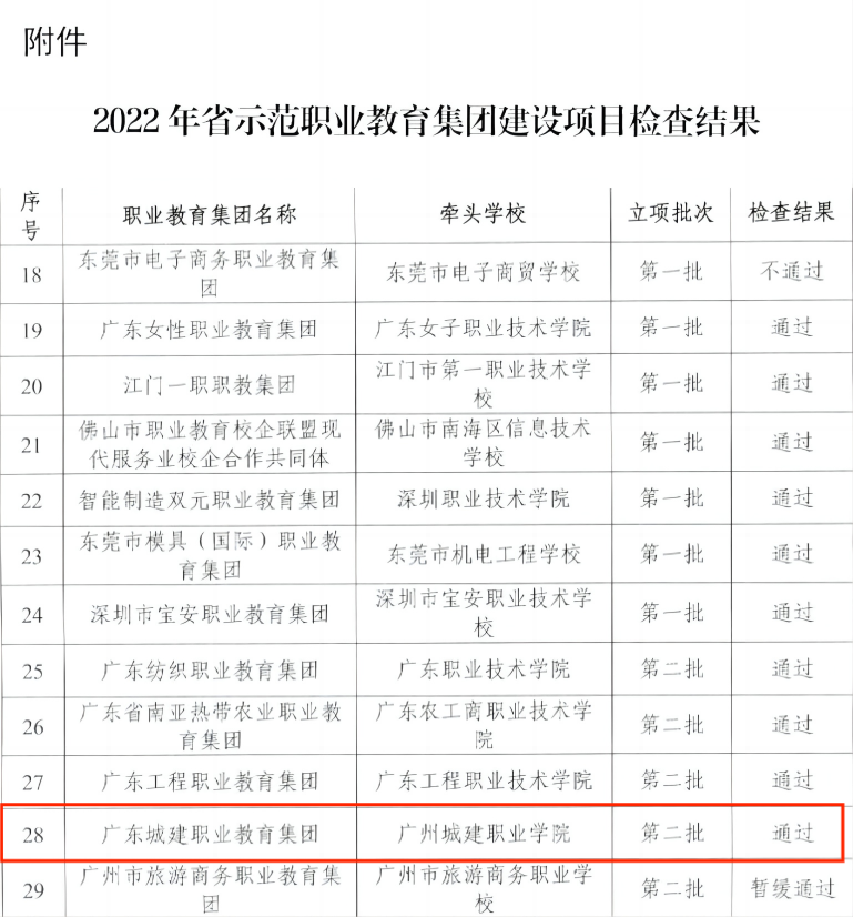 近日,廣東省教育廳公布對全省29個省級示范職業(yè)教育集團的年度檢查情況,由我校牽頭成立的廣東城建職業(yè)教育集團順利通過年度檢查,為本次通過檢查的26個示范性職教集團的牽頭單位中,唯一一所民辦高職院校。