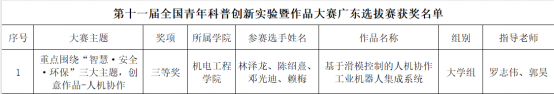 近日,由廣東省科學(xué)技術(shù)協(xié)會(huì)、廣東省教育廳聯(lián)合主辦的第十一屆全國青年科普創(chuàng)新實(shí)驗(yàn)暨作品大賽廣東選拔賽公布獲獎(jiǎng)名單。我校獲三等獎(jiǎng)1項(xiàng),也是唯一一所獲獎(jiǎng)的民辦高職院校。