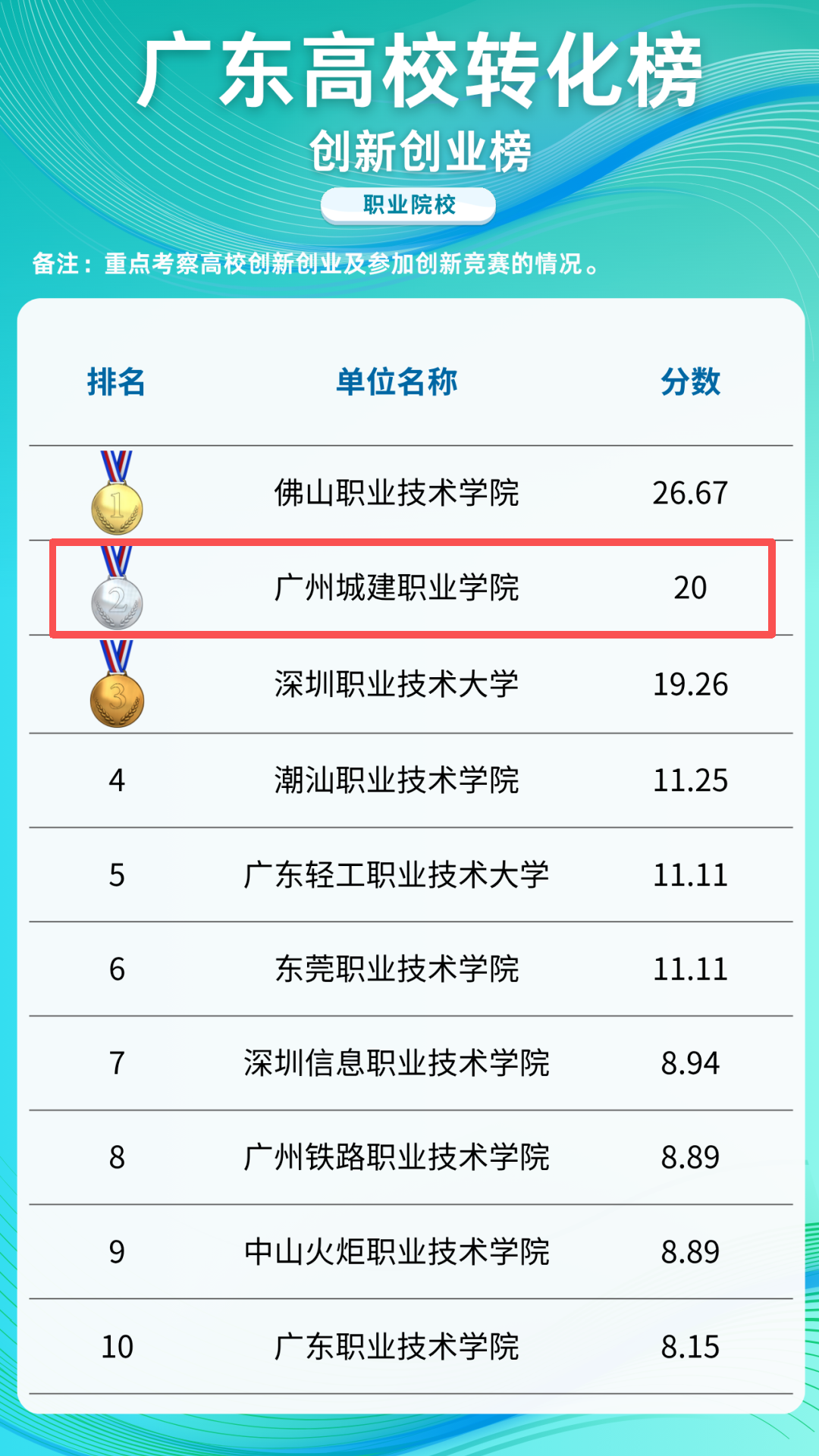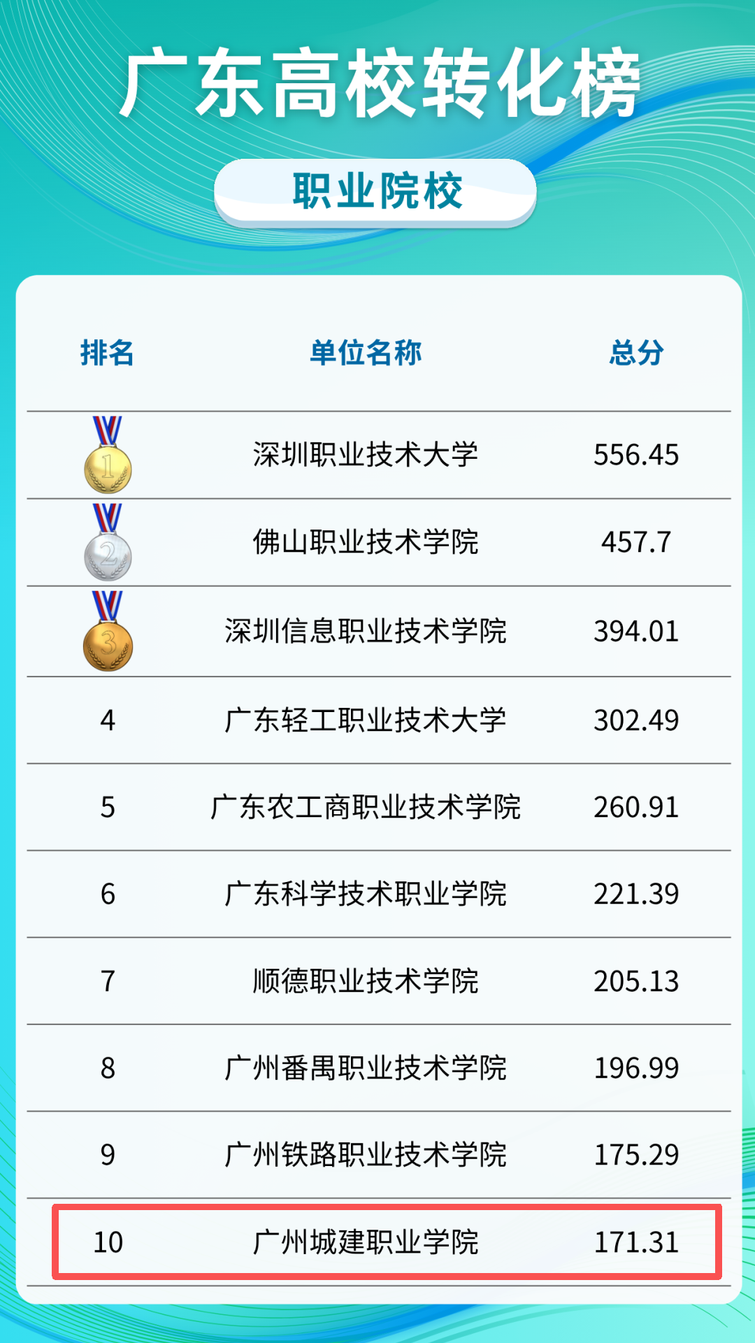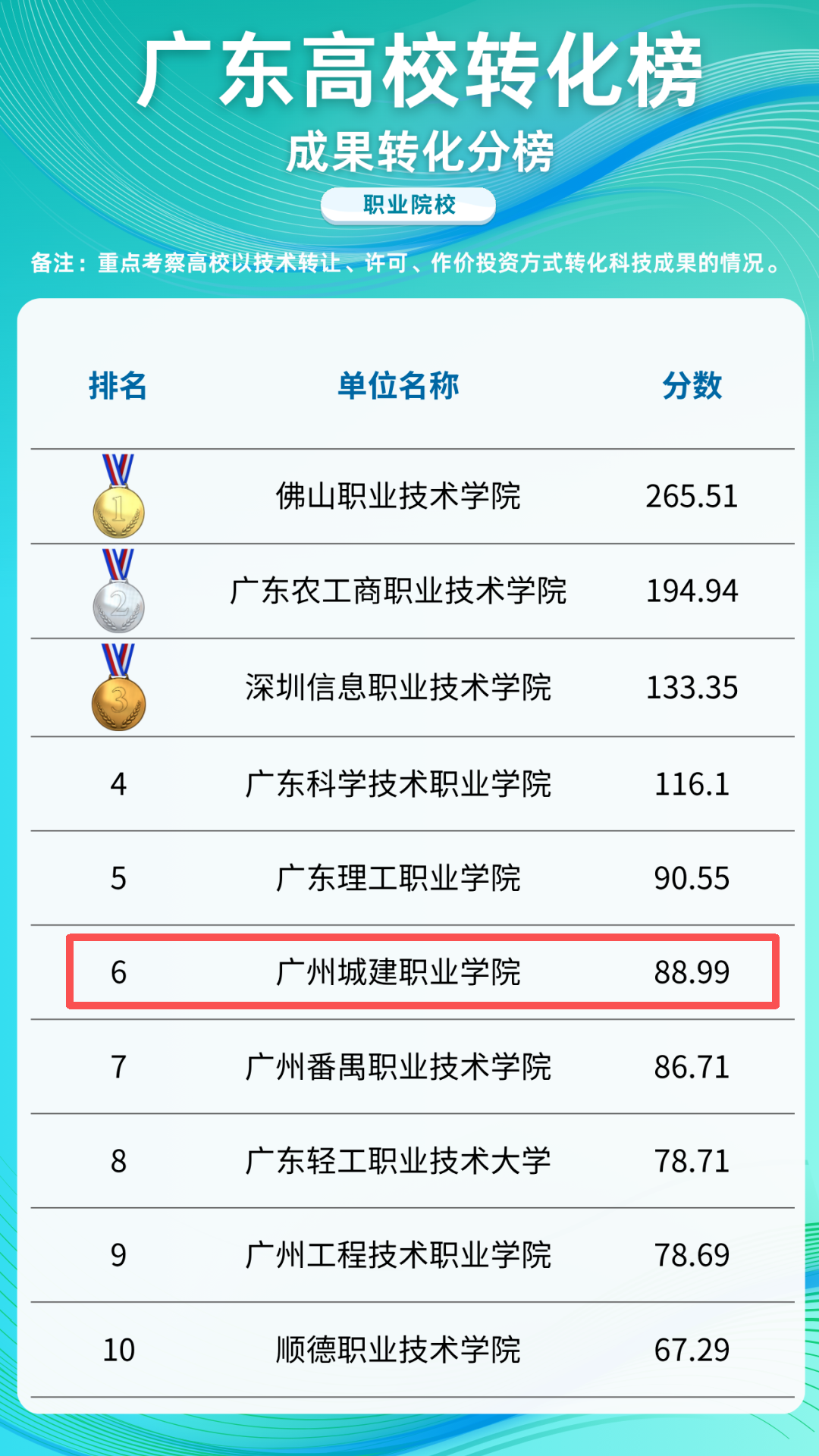 近日,廣東高??萍汲晒D化中心發(fā)布“2024廣東高校轉化榜——職業(yè)院?!?。該榜單圍繞轉化基礎、成果轉化、產(chǎn)學研合作、創(chuàng)新創(chuàng)業(yè)四個維度,結合27項細分指標,對全省162所高校的科技成果轉化能力進行綜合評估。我校以總分171.31分的優(yōu)異成績位列全省職業(yè)院校第十,并在成果轉化、創(chuàng)新創(chuàng)業(yè)兩個專項榜單中分獲第六名和第二名。