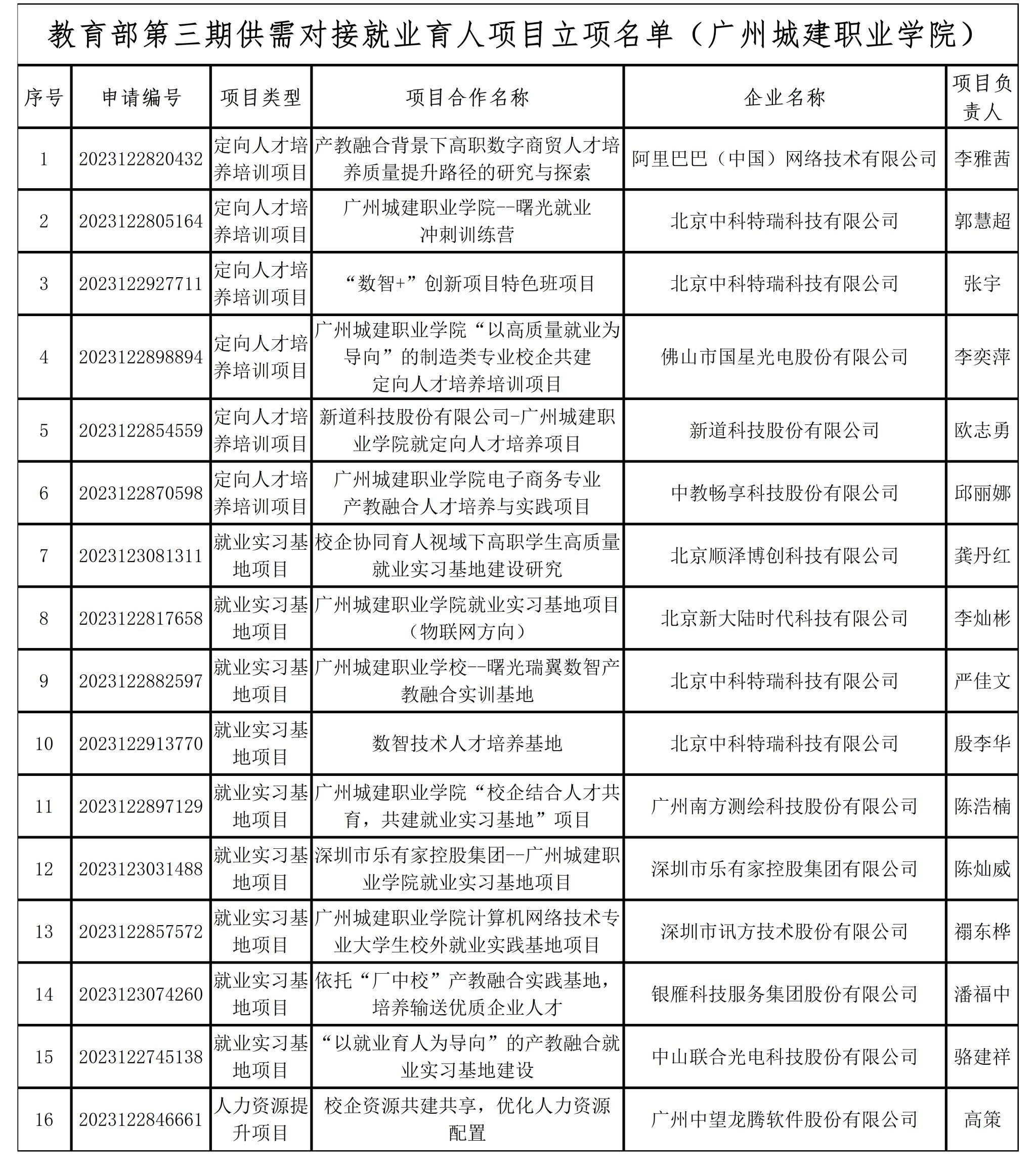 據(jù)《關(guān)于公布教育部第三期供需對(duì)接就業(yè)育人項(xiàng)目立項(xiàng)名單的通知》(教就業(yè)司函〔2024〕23號(hào))獲悉,我校與阿里巴巴(中國)網(wǎng)絡(luò)技有限公司、北京中科特瑞科技有限公司、美的集團(tuán)股份有限公司、廣州南方測(cè)繪科技股份有限公司等21家用人單位對(duì)接申報(bào)的27個(gè)供需對(duì)接就業(yè)育人項(xiàng)目獲教育部批準(zhǔn)立項(xiàng)。