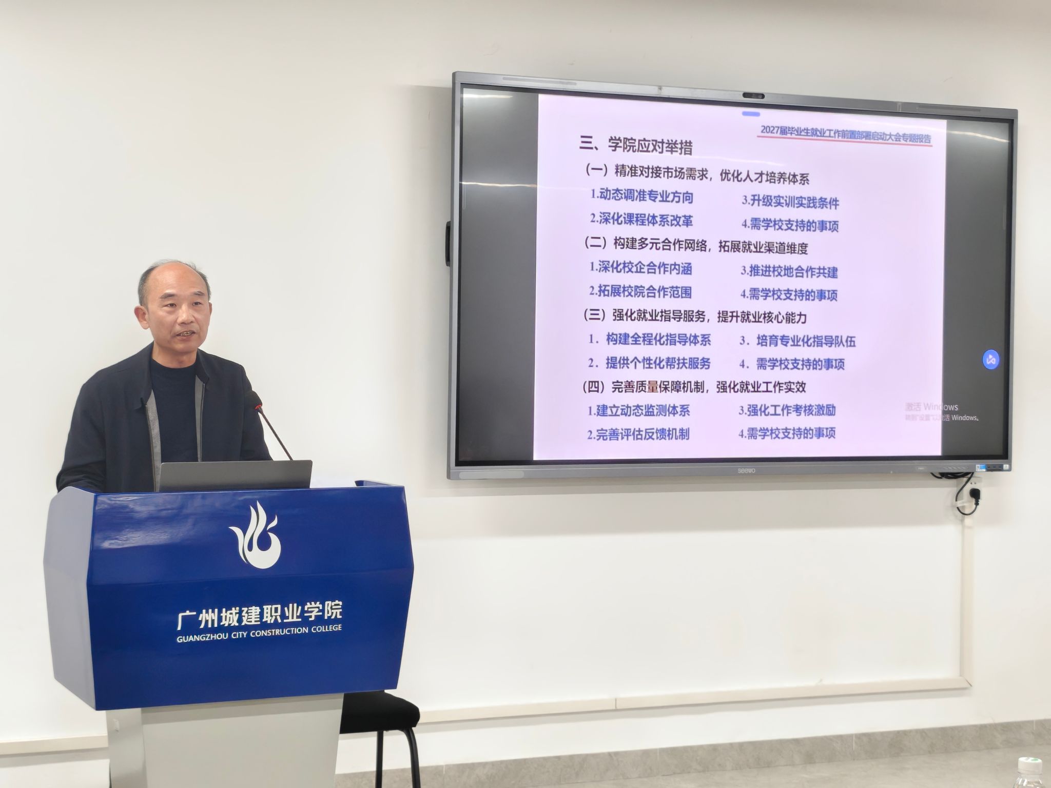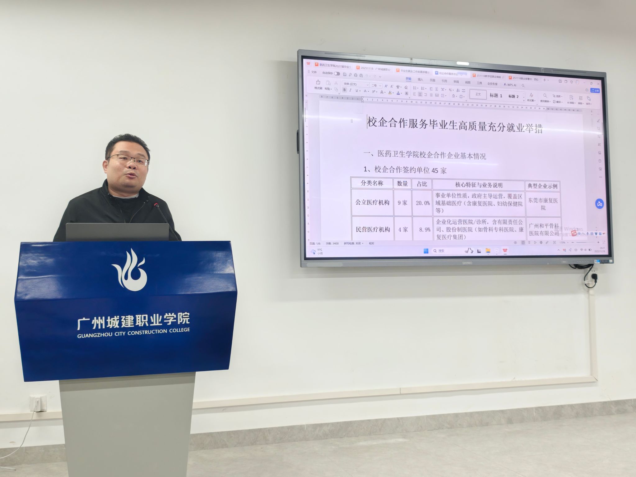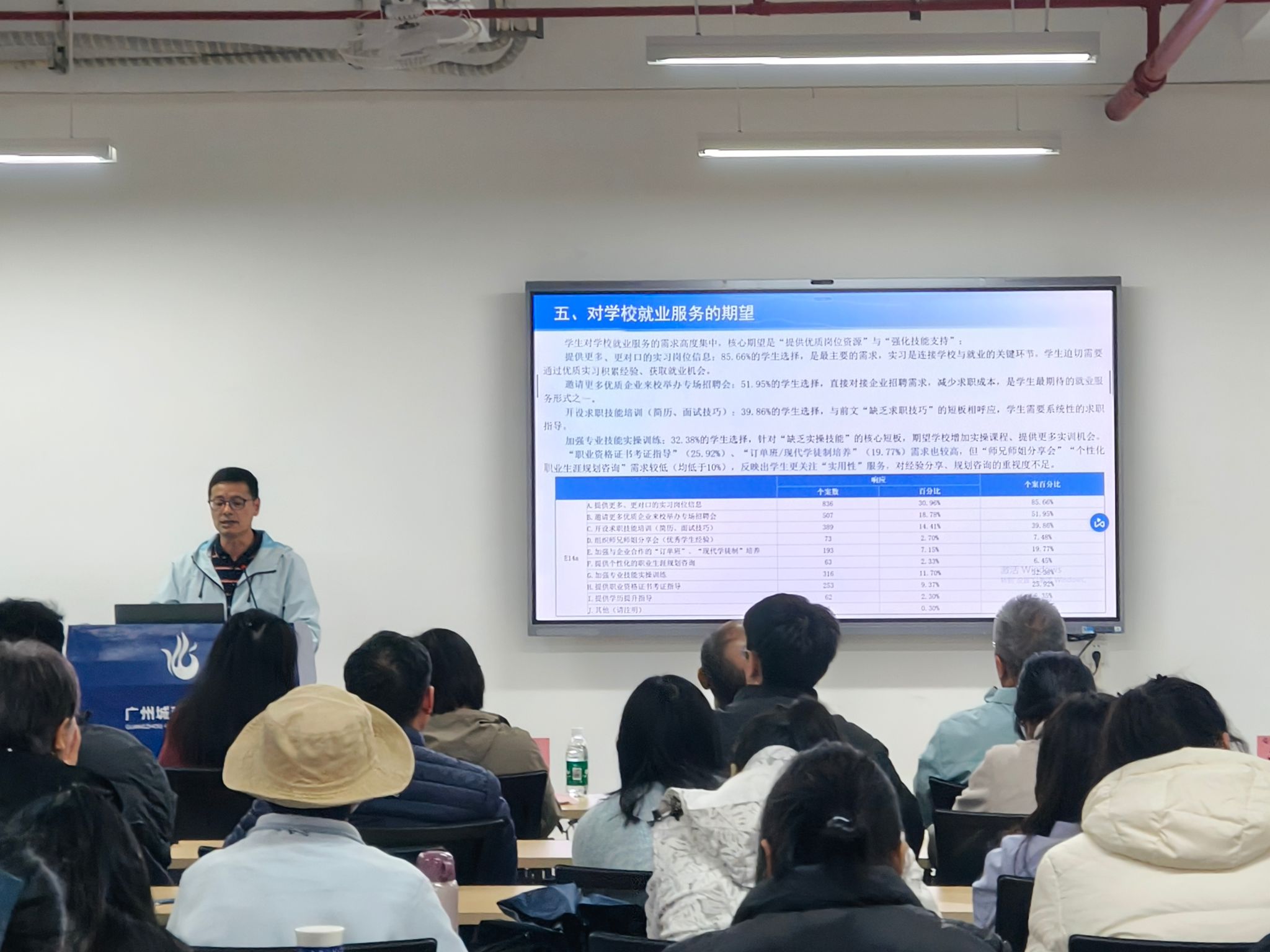 會上,潘福中全面解讀《廣州城建職業(yè)學(xué)院醫(yī)藥衛(wèi)生學(xué)院2027屆畢業(yè)生畢業(yè)去向調(diào)查報告》,從畢業(yè)去向傾向、就業(yè)意向期望、就業(yè)準(zhǔn)備與心態(tài)、升學(xué)規(guī)劃與心態(tài)、對學(xué)校就業(yè)服務(wù)期望等層面系統(tǒng)分析醫(yī)藥衛(wèi)生學(xué)院2027屆畢業(yè)生的就業(yè)選擇及就業(yè)服務(wù)需求。他針對學(xué)生就業(yè)傾向、就業(yè)焦慮、就業(yè)準(zhǔn)備等問題,提出五項關(guān)鍵對策:一是強化畢業(yè)去向引導(dǎo),精準(zhǔn)匹配學(xué)生發(fā)展需求;二是聚焦核心能力提升,增強學(xué)生就業(yè)競爭力;三是深化就業(yè)心態(tài)疏導(dǎo),幫助學(xué)生建立理性求職觀念;四是完善升學(xué)支持體系,滿足學(xué)生學(xué)歷提升需求;五是整合校內(nèi)外資源,提升就業(yè)服務(wù)質(zhì)量。