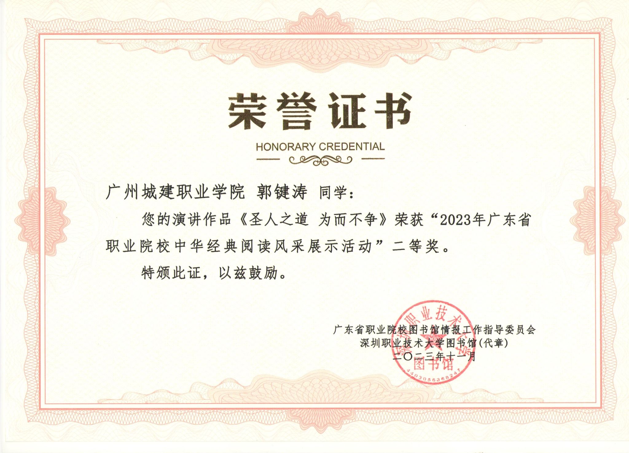 近日,由廣東省職業(yè)院校圖書館情報(bào)工作指導(dǎo)委員會(huì)主辦、深圳職業(yè)技術(shù)大學(xué)圖書館承辦的2023年廣東省職業(yè)院校中華經(jīng)典閱讀風(fēng)采展示活動(dòng)圓滿結(jié)束,我校人文學(xué)院郭鍵濤同學(xué)的作品《圣人之道為而不爭》榮獲二等獎(jiǎng)、圖書館胡佳莉老師榮獲優(yōu)秀指導(dǎo)老師、我校榮獲優(yōu)秀組織單位。