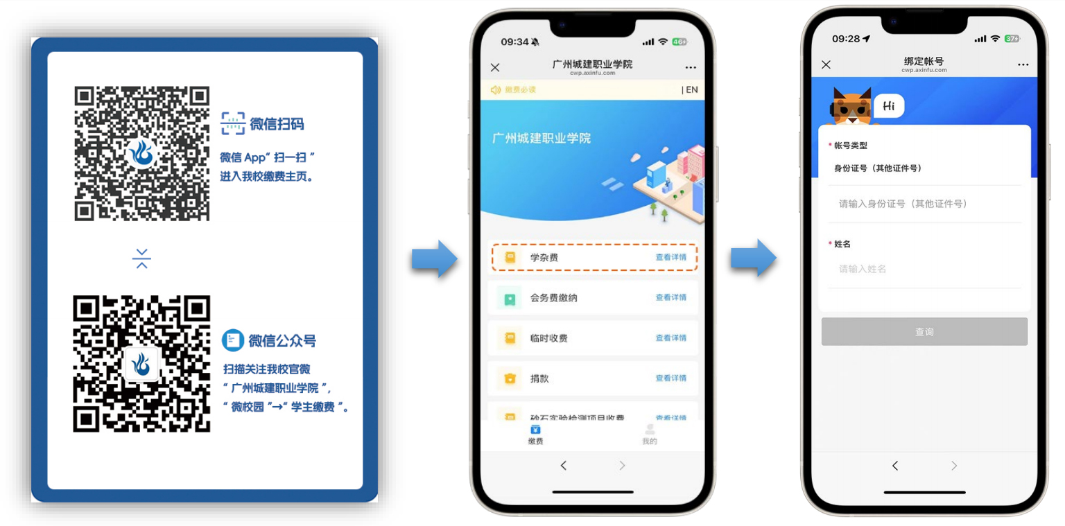 1.用戶可選擇下方不同的二維碼掃描進入我校繳費主頁面,點擊“學(xué)雜費”進入,在登錄頁面依次填寫身份證號+姓名,點擊“查詢”,可看到目前該賬號的待繳費項目。
