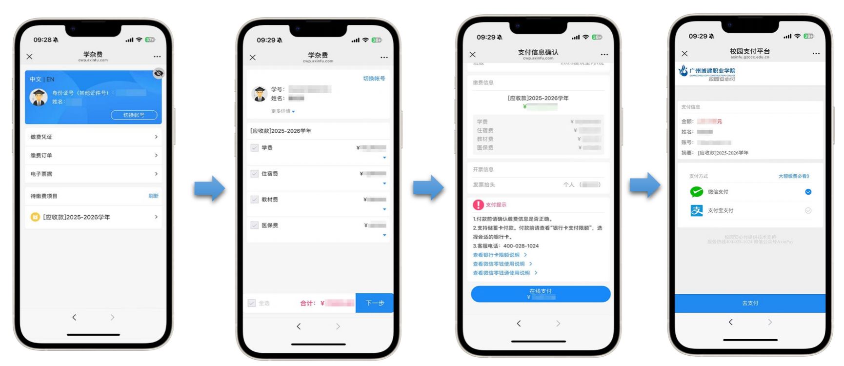 2.點擊進入查看詳情(*繳費項目及金額以實際顯示為準),默認全選繳費子項目點擊“下一步”核實繳費信息無誤點擊“在線支付”,選擇“支付寶支付”或“微信支付”跳轉(zhuǎn)其官方頁面完成支付即可。