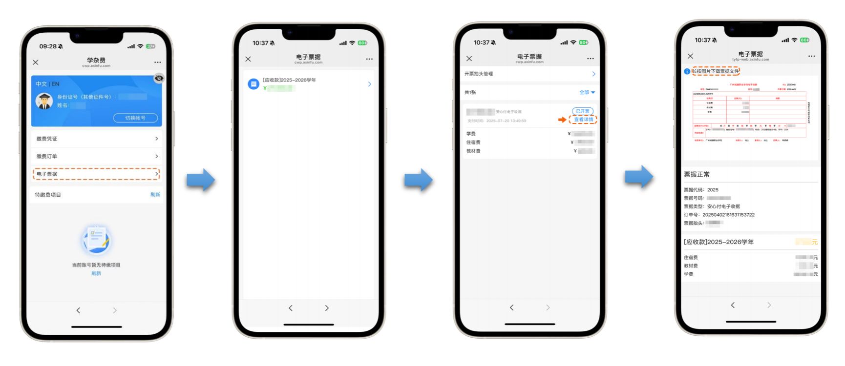 繳費完成后回到繳費主頁點擊“電子票據(jù)”可查到目前賬號的繳費記錄,點擊相應(yīng)項目可查看電子票據(jù)開具詳情,只有“已開票”狀態(tài)的才可查看及下載,點擊“查看詳情”進入,如需打印可自行下載打印。