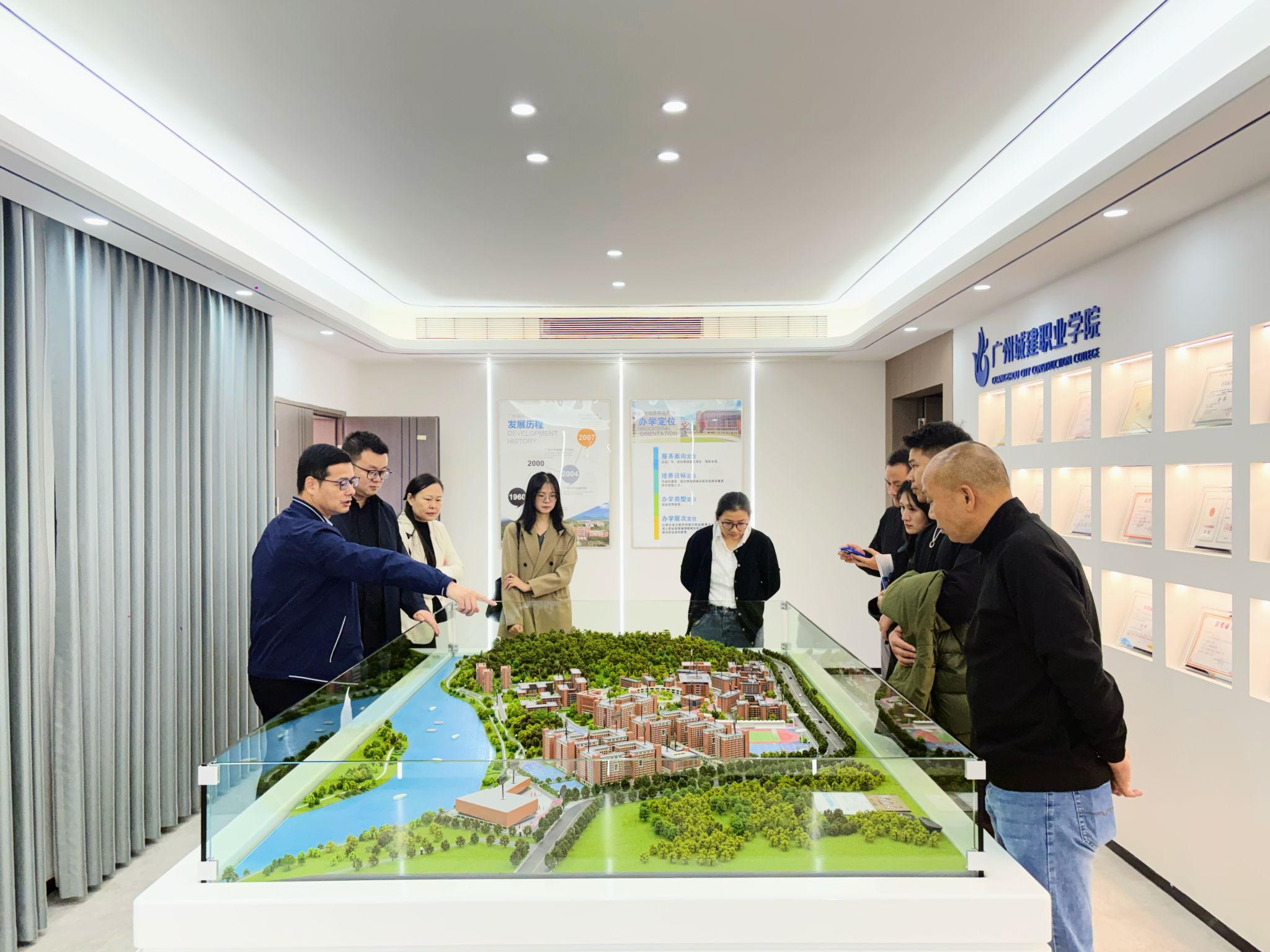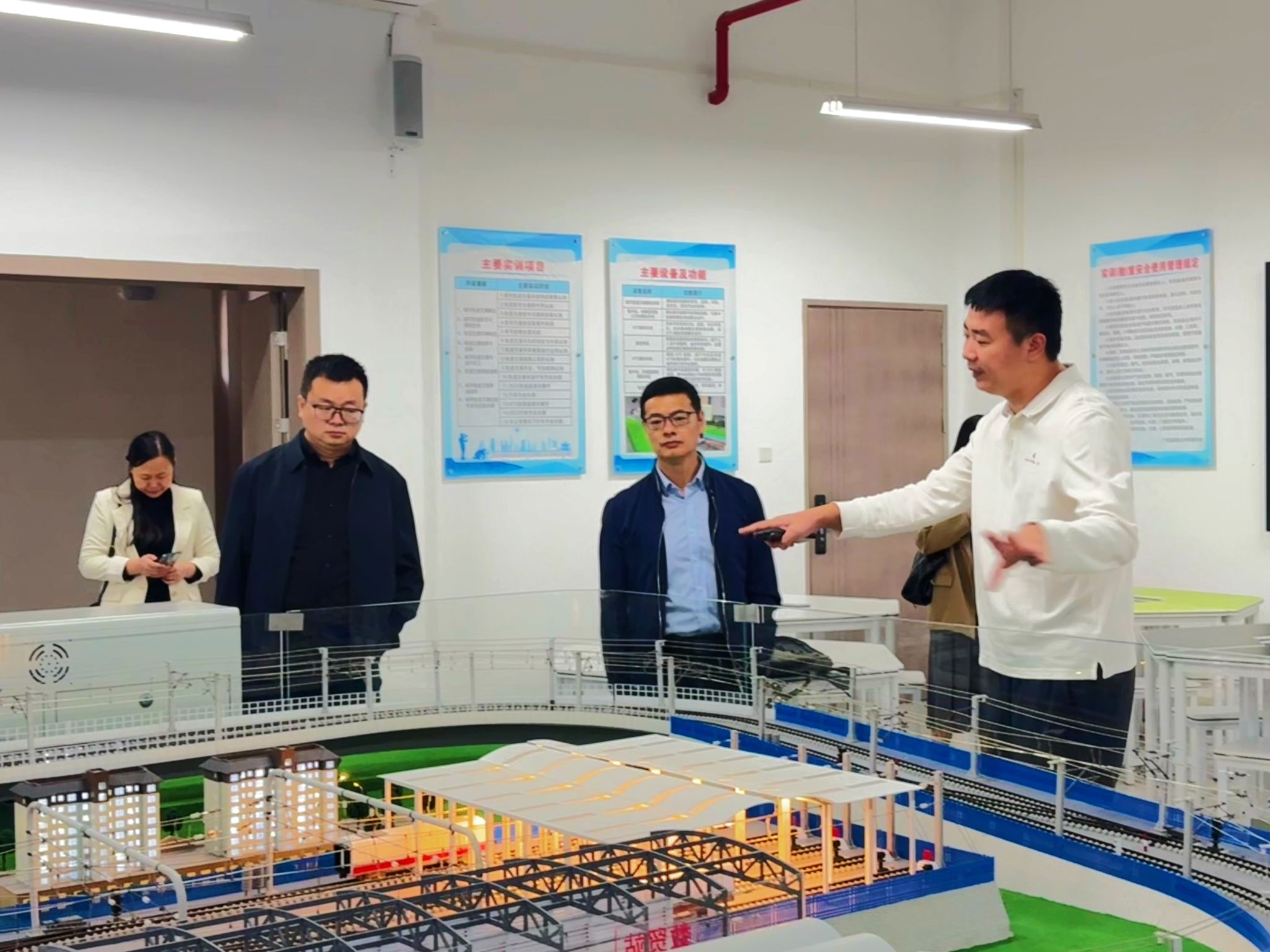 活動(dòng)伊始,潘福中處長帶領(lǐng)與會(huì)人員參觀學(xué)校清遠(yuǎn)校區(qū)規(guī)劃沙盤模型,詳細(xì)介紹校園整體規(guī)劃、功能布局及發(fā)展建設(shè)成果。隨后,實(shí)地走訪軌道交通學(xué)院與醫(yī)藥衛(wèi)生學(xué)院的實(shí)訓(xùn)室,現(xiàn)場觀摩相關(guān)專業(yè)的實(shí)踐教學(xué)環(huán)境和技能培訓(xùn)實(shí)操場景。