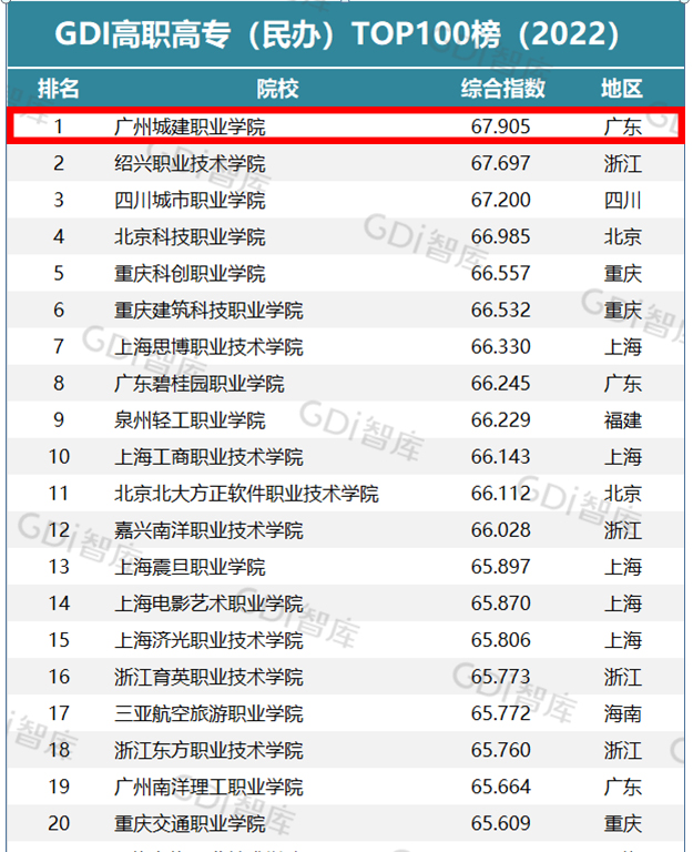 GDI高職高專排行榜(2022)發(fā)布 我校位居全國民辦高職院校榜首